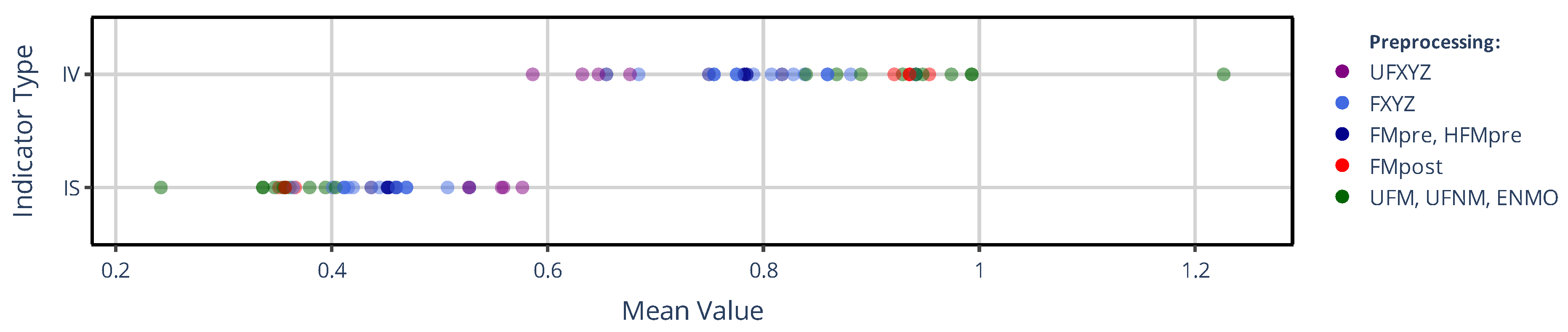 In Figure 4, the counterpart to the previous figure is shown for the mean values of the IV and IS indicators. In this case, however, the color coding of the mean values—contrary to Figure 3—is based on the preprocessing families, since they group according to the preprocessing techniques applied to the acceleration signal and not based on whether the activity metric was threshold-based or not. These clusters that clearly resemble the structure of the correlation-based similarity matrix (see Figure 2) appear in the same order for IS and IV—albeit with opposite directionality.