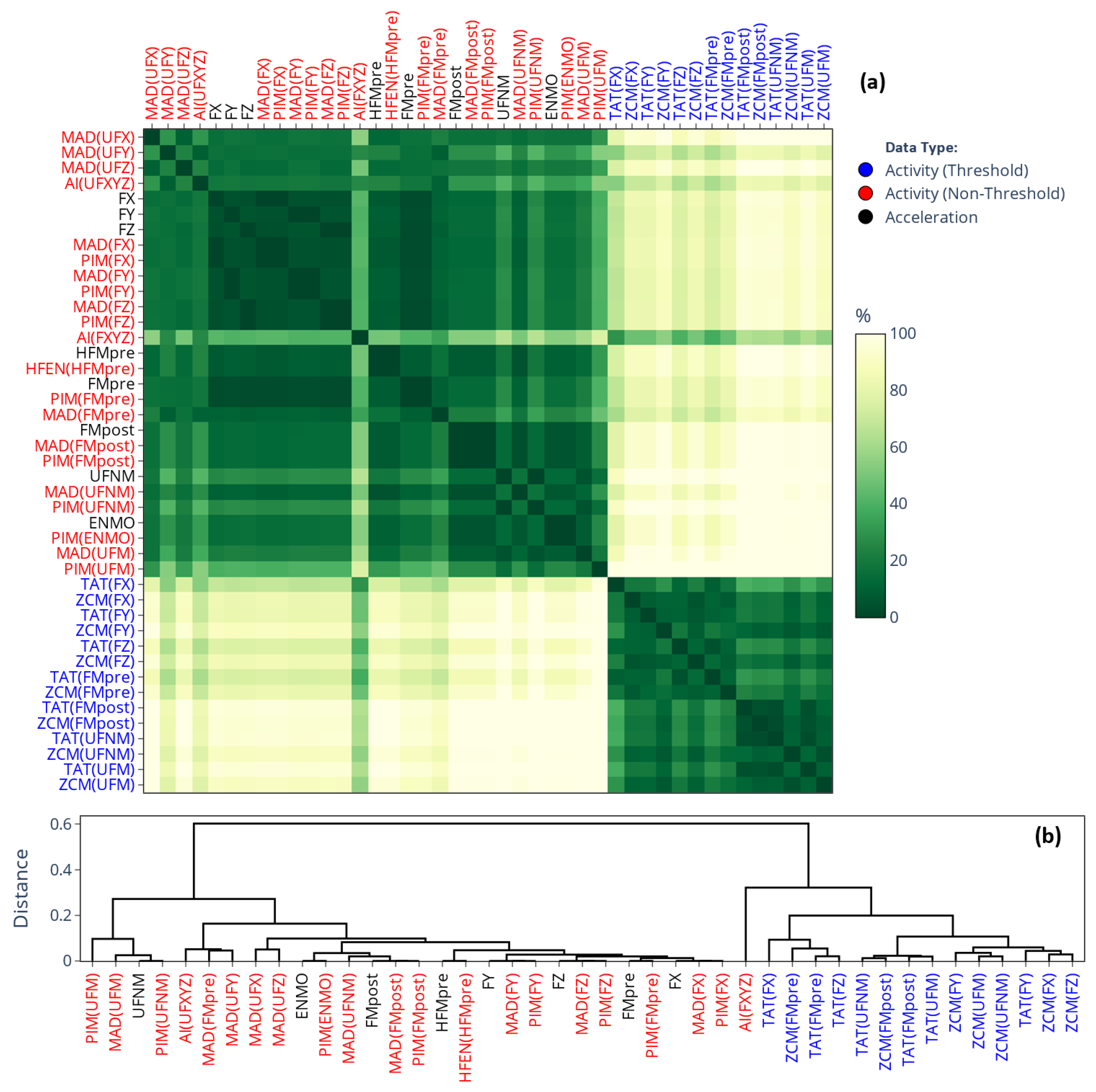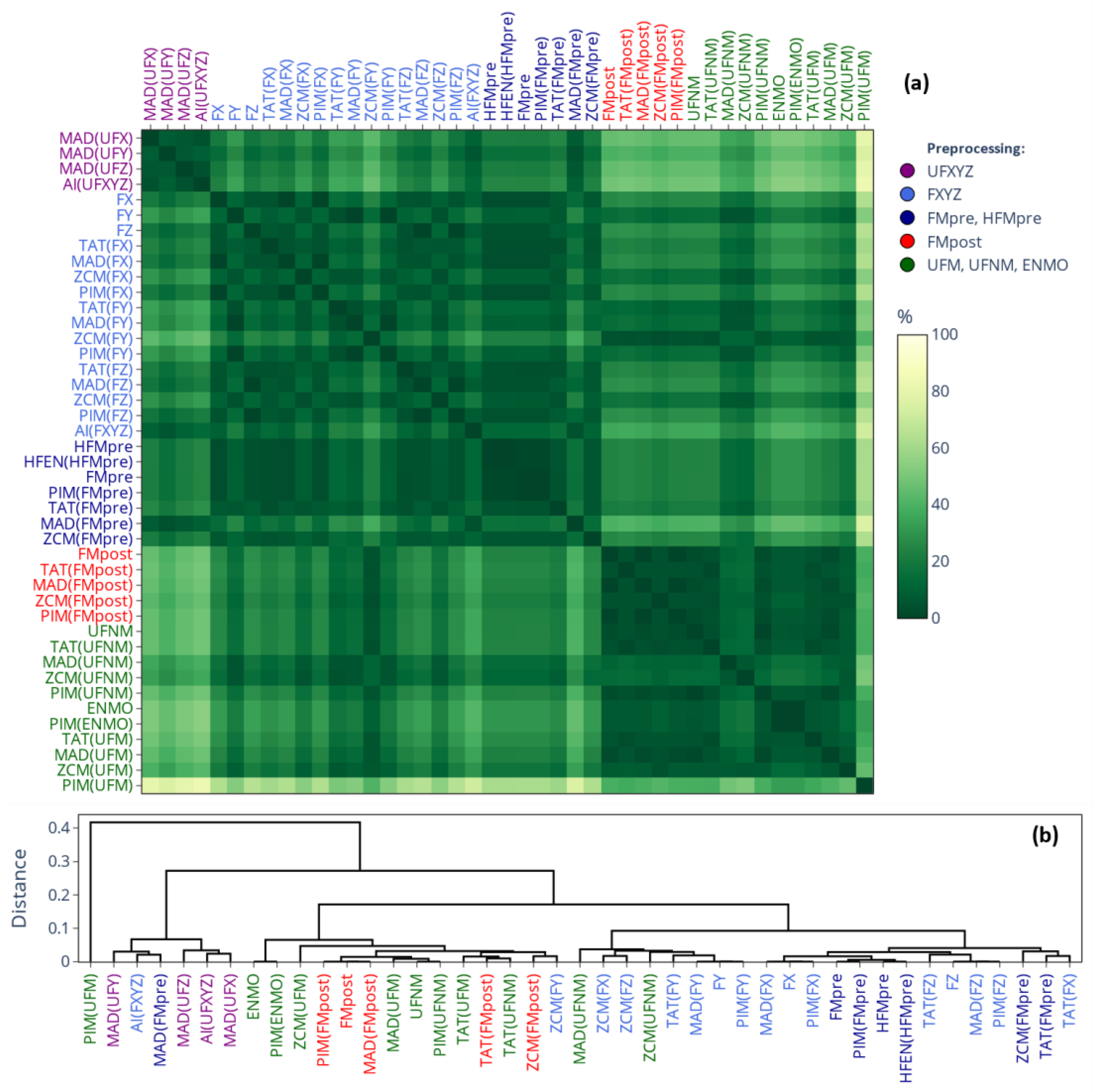 Figure 6. (a) Differences in the mean value of IS across 42 subjects depending on which signal-processing pipeline of our generalized framework was used to generate the acceleration or activity data. The cells of the matrix represent SMAPE values ranging from 0% to 200%, with the gradient color scale shifting linearly from green to yellow as SMAPE increases from 0% to 100%. (b) The dendrogram corresponding to the similarity matrix. The label colors in both the similarity matrix and the dendrogram follow the same color coding as in Figure 2 and Figure 4, as indicated in the legend.