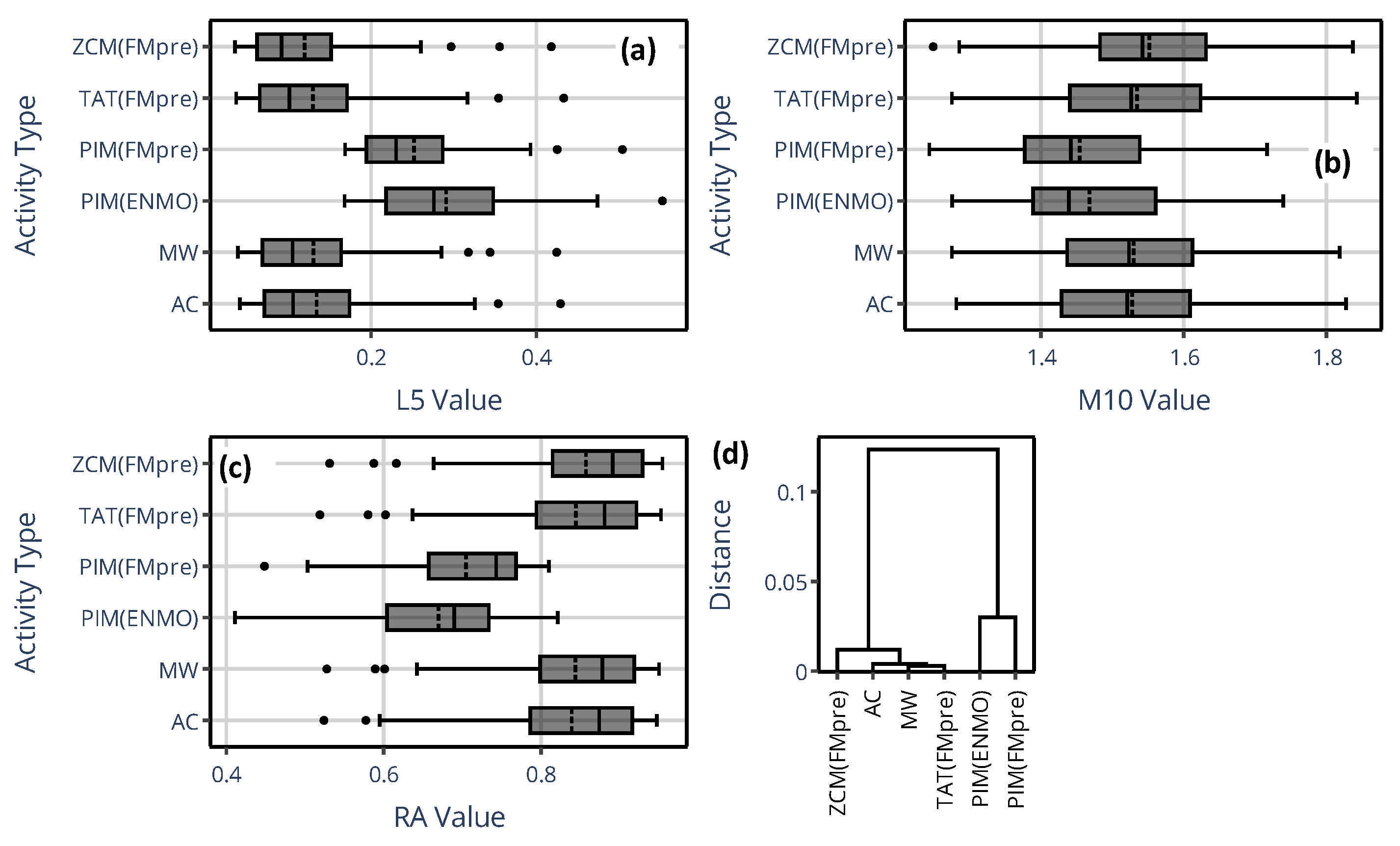 Figure 8 presents the spread of L5, M10, and RA indicator values (each on separate panels, (a) to (c)) across the 42 subjects for specific devices. Since AC and MW are also threshold-based activity metrics like ZCM and TAT, the values form clusters within each indicator depending on whether the activity data were calculated using threshold-based activity metric. This clustering is further substantiated by the dendrogram in panel (d), which is based on the RA. These findings are in line with the observations we made regarding the generalized activity determination methods (see Figure 3). For example, the device specificities of RA are mainly due to the differences in the value of L5, as the interquartile ranges of different devices overlap for the value of M10, but not for the value of L5 and RA. It is crucial to highlight that ZCM, TAT, and PIM are the three classical activity metrics supported by both AMI and Condor Instruments devices. However, since selecting between them is up to scientists when preparing for measurement, only this choice can have a substantial impact on the NPCRA outcomes as shown. For example, the RA value was, on average, close to 0.70 for PIM and 0.86 for ZCM (i.e., an average difference of 0.16 for an indicator that ranges between 0 and 1), and we found that their subject-level difference was statistically significant using a paired t-test (p < 0.001). Since RA values were derived for the same motion, these discrepancies are purely a consequence of how the actigraph was set up (or which device was used), and, remarkably, they are greater for 38 out of the 42 subjects compared to what was observed between pediatric subjects and adults by others using the same device [13].