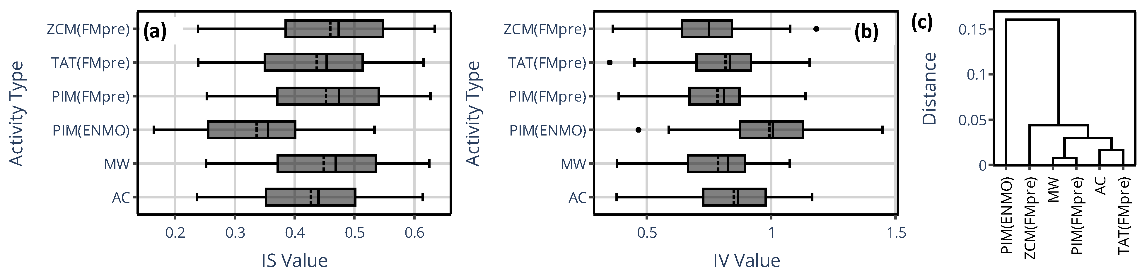 Figure 9 shows the counterpart of the previous figure for the IS and IV indicator values in panels (a) and (b), while panel (c) depicts the dendrogram for IS. The dendrogram clearly shows that the IS derived from activity data based on the activity determination method from GGIR (i.e., PIM(ENMO)) substantially differs from that derived via the rest of the methods. Since PIM(ENMO) is the only activity determination method in this narrower set where digital filtering was not involved in the preprocessing of acceleration data, this behavior aligns with the observation we made regarding the generalized activity determination methods (see Figure 4): the differences device selection can introduce in the IS and IV are primarily driven by how the acceleration data have been preprocessed rather than the activity metric. For both IV and IS, the greatest discrepancies occurred between PIM(ENMO) from the GGIR package and ZCM(FMpre) supported by the AMI and Condor Instruments devices (for example, on average, 0.99 vs. 0.75 for IV, respectively).