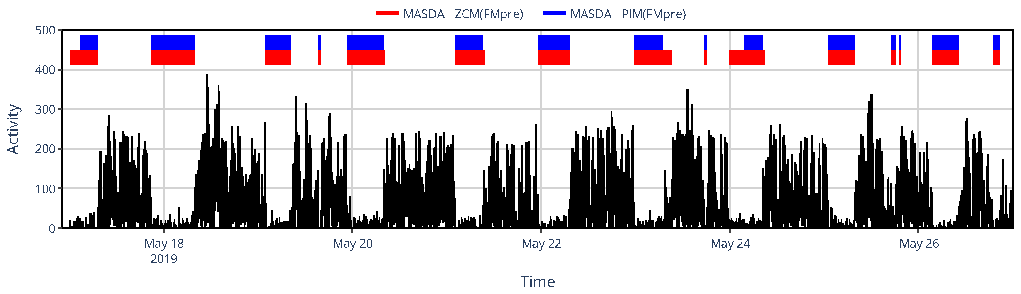 To demonstrate how selecting from among specific actigraphic devices used in the literature affects the values of NPCRA indicators and sleep–wake scoring, we performed the analysis on a narrower set of activity determination methods of specific devices. These methods were applied to the raw acceleration data to emulate the outputs of those specific devices. As defined in Section 2.2.2, this narrower set includes the algorithms of AMI and Condon Instruments devices, namely, PIM(FMpre), ZCM(FMpre), and TAT(FMpre); PIM(ENMO) of the GGIR package from the above analysis; and, as new additions, the specific algorithms used in Ametris and CamNTech devices (AC and MW, respectively).