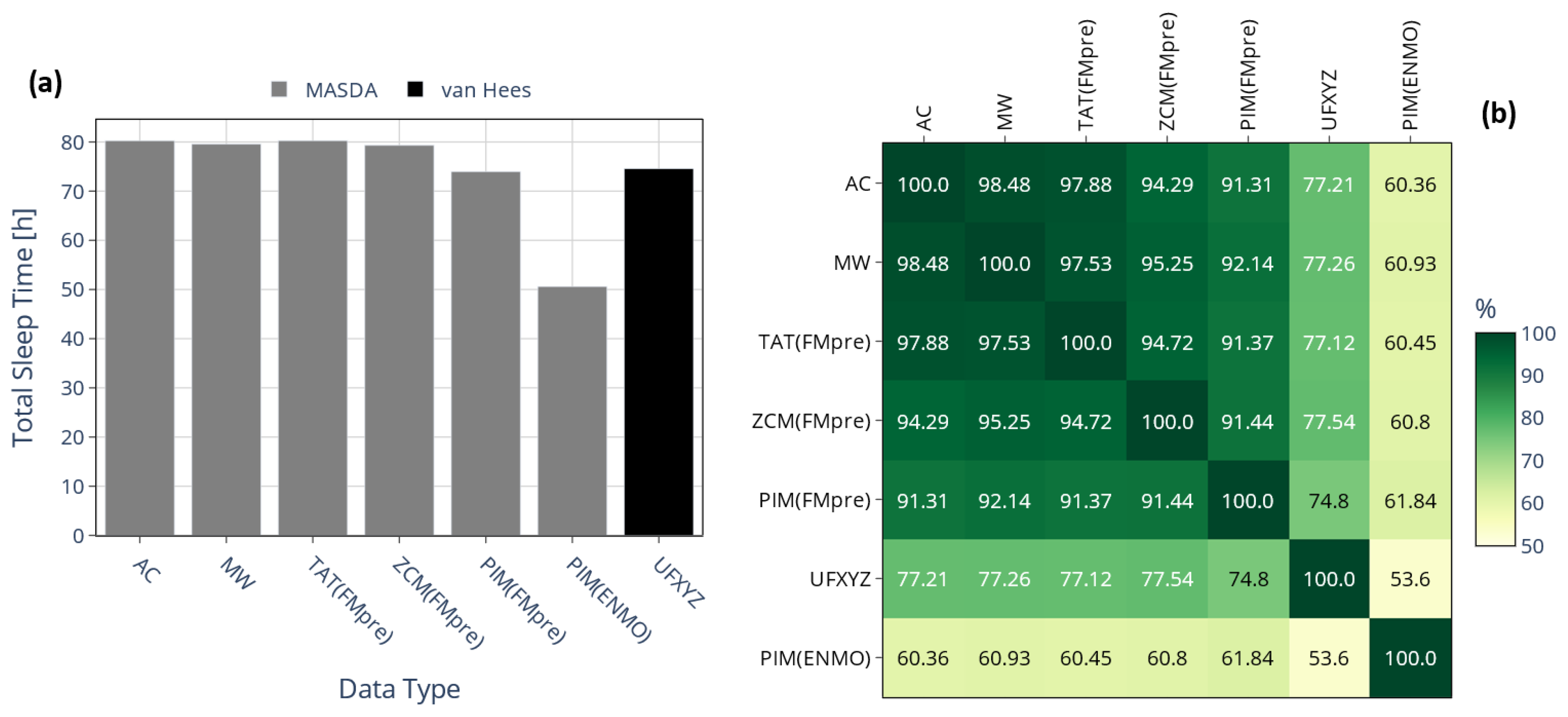 Figure 11. (a) The mean TST across 42 subjects is shown depending on whether sleep was scored based on the raw acceleration data using the van Hees algorithm (black bar) or by the MASDA algorithm based on the activity data of specific devices (grey bars). (b) The mean percentage overlaps between the aforementioned sleep segments, ranging from 100% to 0%, with the gradient color scale shifting linearly from green to yellow as overlap decreases from 100% to 50%.
