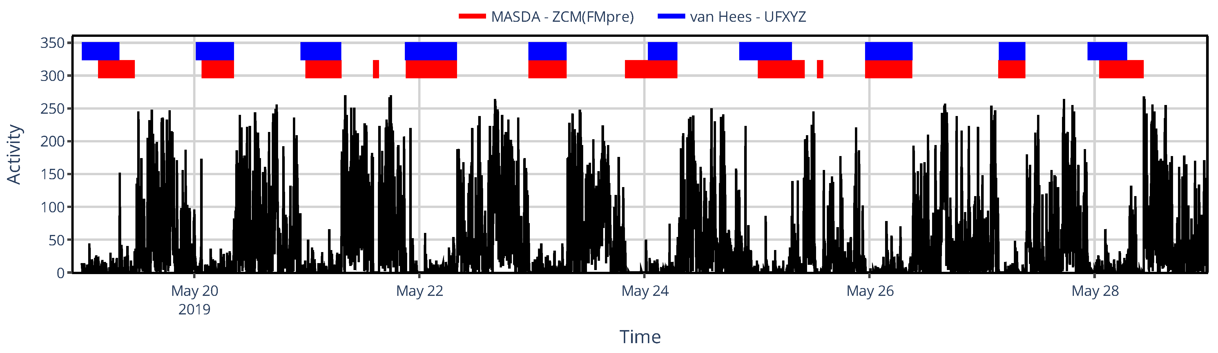 Figure 12. An example of sleep–wake scoring for a representative subject, showing designated sleep intervals obtained using the MASDA algorithm applied to the ZCM activity data of AMI/ActTrust devices (red) and the van Hees algorithm applied to the underlying, raw acceleration data (blue). The black trace shows the subject’s activity data to aid visual interpretation.