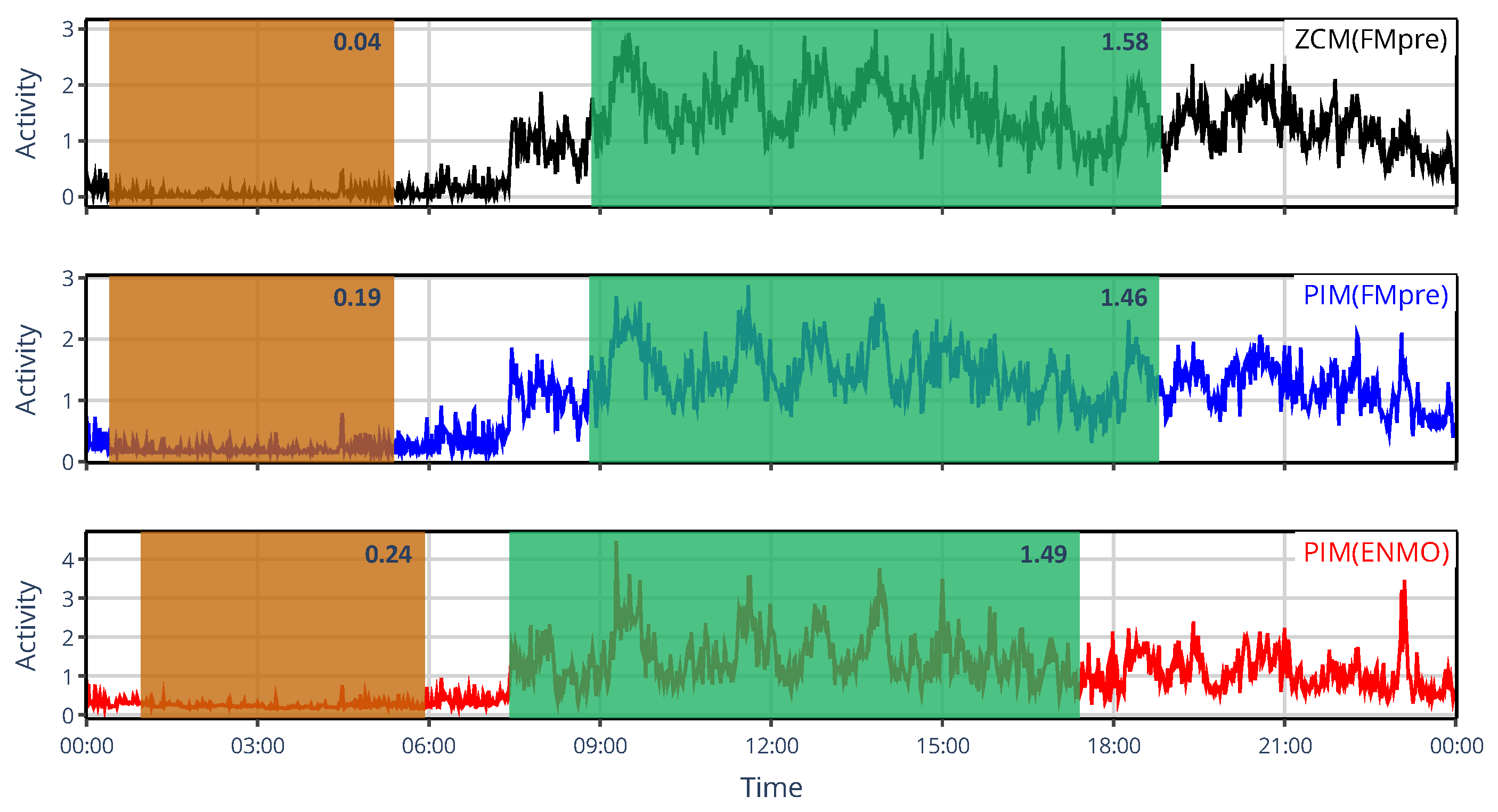 Figure 13. The 24 h mean activity profile of the same representative subject, whose locomotor activity was quantified using the ZMC(FMpre) (black), PIM(FMpre) (blue), and PIM(ENMO) (red) activity-determination methods. The designated L5 and M10 windows are shaded in orange and green, respectively, while the corresponding indicator values are shown at the top right corner.