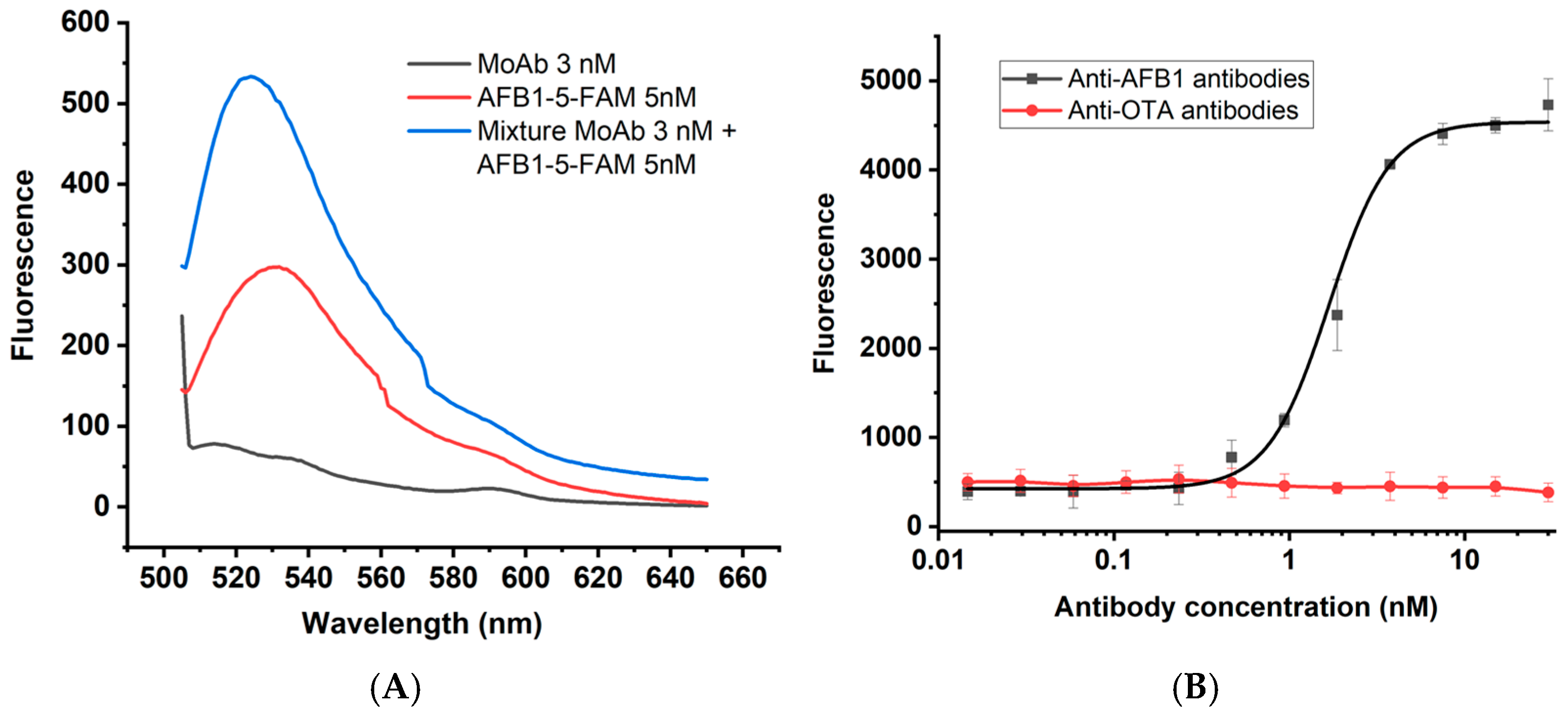 2.4. Testing the Binding of Fluorescein-AFB1 Conjugate to Antibodies
