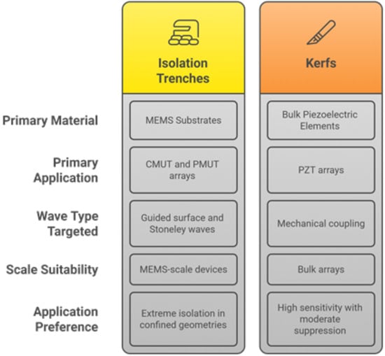 Although isolation trenches and kerfs are sometimes mentioned interchangeably, they differ fundamentally in implementation and application. Isolation trenches are micro-fabricated separations commonly used in CMUT and PMUT arrays, designed to block guided surface and Stoneley waves within MEMS substrates. They are particularly effective in high-precision applications, such as intraluminal medical imaging, by minimizing acoustic coupling through shared substrates [57,115]. Kerfs, on the other hand, are mechanical cuts introduced between bulk piezoelectric elements, primarily in PZT arrays, to minimize mechanical coupling across the ceramic substrate [85]. While both approaches aim at reducing crosstalk, trenches are more suited to MEMS-scale devices where precision etching is feasible, whereas kerfs remain the standard solution for bulk arrays where mechanical robustness is critical; trenches are generally preferred for applications requiring extreme isolation in confined geometries, whereas kerfs are suitable when maintaining high sensitivity alongside moderate crosstalk suppression. Alternative approaches, such as aerogel layers or single-crystal configurations, can further enhance crosstalk reduction, achieving improvements of 31.5% and 6–8.8 dB, respectively [54,116] (Figure 5).