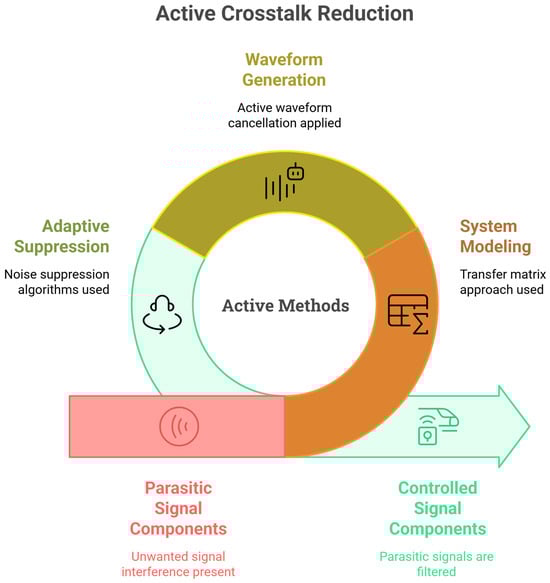 The use of damping materials represents another passive approach that addresses crosstalk by targeting energy dissipation mechanisms. These materials absorb and convert acoustic energy, often into heat, thereby reducing spurious signal propagation within the transducer housing. In ultrasonic gas flowmeters, matrix composites containing suspended particles have been shown to reduce both noise and crosstalk, enabling more accurate signal detection in gaseous environments [117]. Materials designed to match the acoustic impedance of the surrounding structure further help minimize reflection and energy buildup, as shown in composites incorporating tungsten additives [118]. Some damping layers incorporate conductive particles within a piezoelectric matrix to convert acoustic energy into thermal energy, which has proven effective in high-precision environments [119]. This approach is commonly used in imaging devices, where fluid damping layers applied to the transducer interior have improved image clarity by suppressing internal reverberations [120]. However, the risk of excessive damping in ultrasonic and MEMS transducers can degrade both the sensitivity and resolution, reducing the dynamic response and signal detection capability [121,122,123,124,125]. It may also alter the mechanical and electrical characteristics, introducing impedance in CMUTs and suppressing essential electromechanical resonances in piezoelectric actuators [126,127]. Careful optimization is therefore required to balance the noise suppression and resonance control with the performance, particularly in high-frequency or MRI-compatible applications [128].