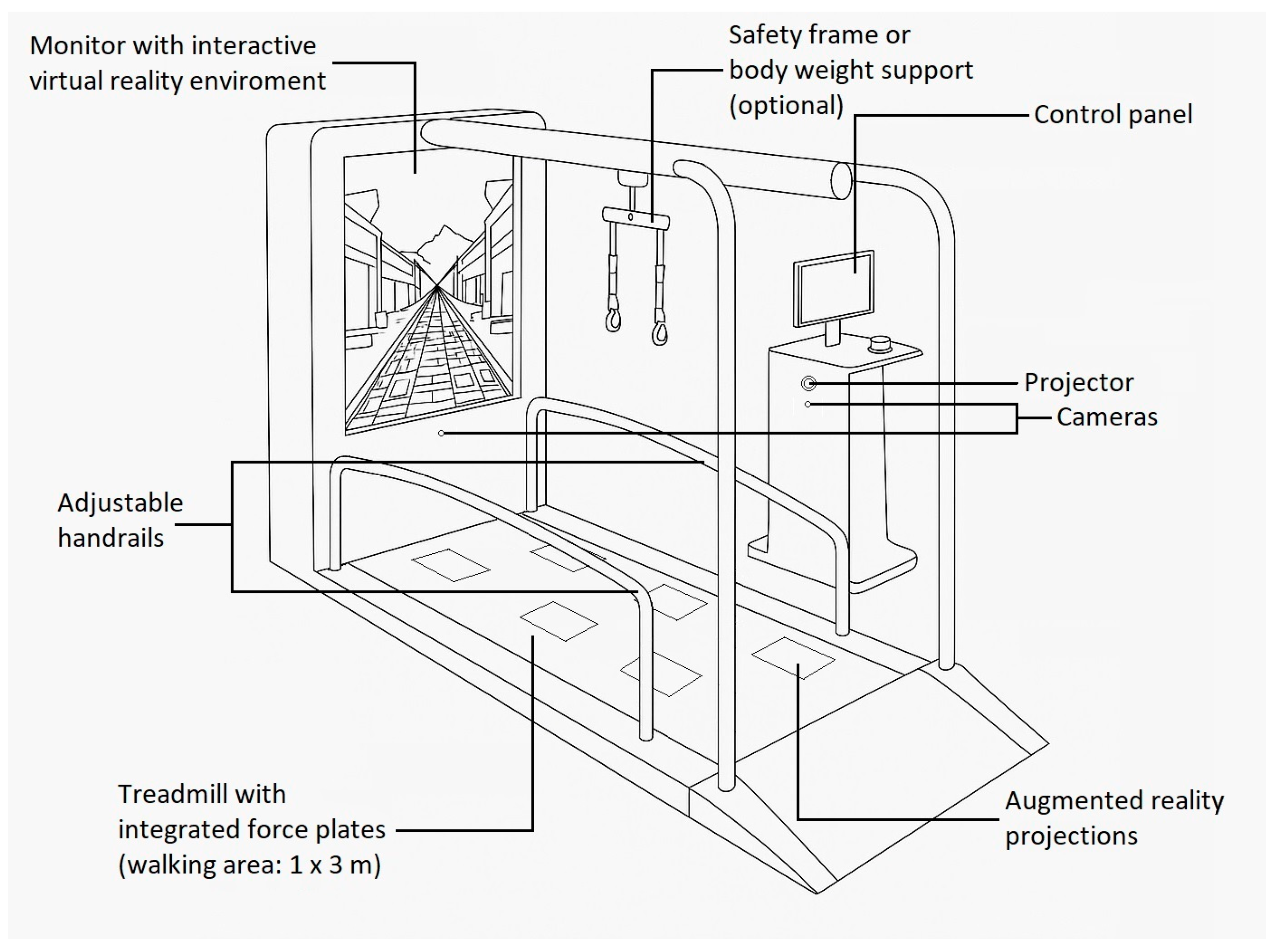 Figure 2). The C-Mill VR+ system is a 3 m long and 1 m wide treadmill with a force platform underneath. In front of the treadmill, a 65” fixed-position monitor provides the virtual reality environment, and a projector located next to the treadmill allows various tasks to be projected onto the treadmill’s ribbon, with immediate real-time feedback to the patient and therapist via the force platform. The system is controlled from a PC running Windows 10-64-bit using CueFors (2.6.4) software. The computer provides the therapist with real-time detailed data on the patient’s COP path and gait parameters, which are reported in detail after the task is completed, allowing for personalized therapy. The tool allows the implementation of several types of exercises: balance exercises, goal-directed stepping with or without obstacles, obstacle crossings, gait acceleration and deceleration by maintaining position within a projected walking area that moves along the treadmill, tandem stepping, step length and step phase manipulation, gait pace manipulation with auditory stimuli, and adaptive gait modulation task. Based on the feedback from the system, the therapist can tailor the training to the individual by increasing/decreasing the speed of the treadmill, the number/size of obstacles, the available reaction time, and the difficulty of the task.