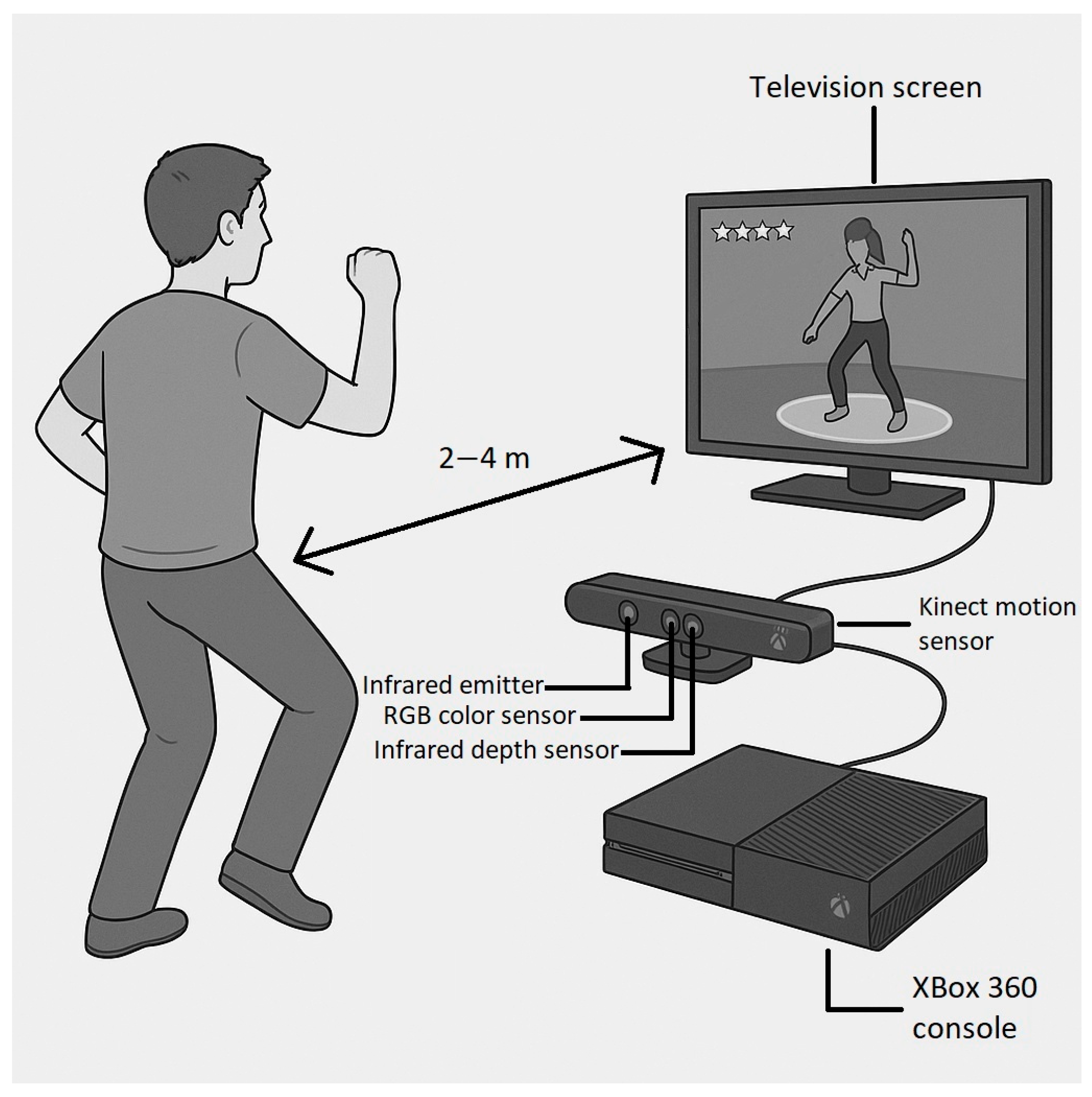 Figure 3). Despite the fact that newer versions and updates are available, this setup fulfilled the requirements. Movements, body posture, and even face gestures can be detected using RGB and infrared cameras. In addition, depth mapping is also available. Three different VR programs were used during the intervention: Kinect Adventure—Reflex Ridge, Kinect Adventure—Space Pop, and Just Dance.