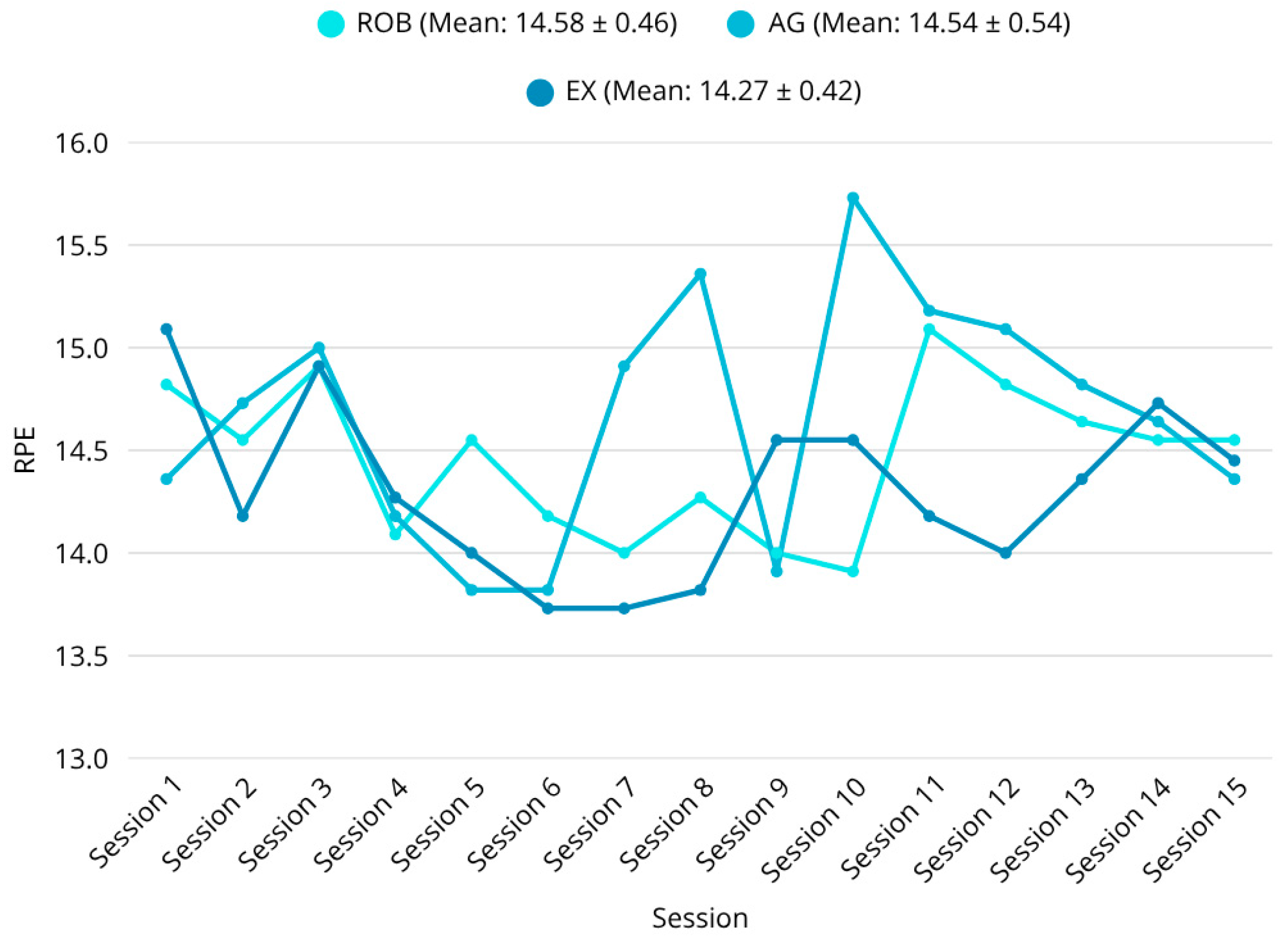 56]. Notably, perceived exertion, measured via the RPE scale, was significantly lower post-intervention in the exergaming group during several training timepoints (e.g., RPE (session 10): ROB vs. AG,