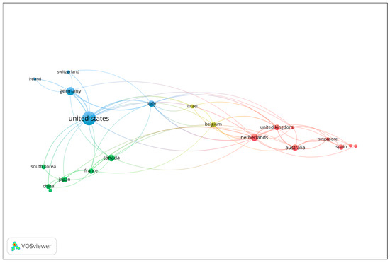 Co-authorship analysis at the country level was performed to explore patterns of international collaboration in the field of gait analysis and wearable technologies for early dementia detection. Countries contributing to at least two publications were included in the analysis. The number of documents served as the weighting metric, and the resulting network visualization is presented in Figure 2. Each node represents a country, with node size corresponding to the number of publications, and the connecting lines (links) indicating collaborative relationships based on co-authored documents. The color coding reflects distinct collaboration clusters, which highlight regional and transnational research partnerships. The visualization reveals that the United States occupies a central and dominant position within the network, demonstrating extensive collaborative links with several European and Asian countries. Strong research connections are observed between the United States, the United Kingdom, Italy, Germany, and the Netherlands, forming a core collaborative cluster that drives much of the scholarly output in the field. Other notable contributors, including Canada, Australia, and Japan, also exhibit active engagement within this network, though to a lesser extent. Overall, the co-authorship network underscores the highly collaborative and international nature of research in this domain, with a concentration of productivity and influence in a few key countries that serve as major hubs of scientific exchange and interdisciplinary innovation.