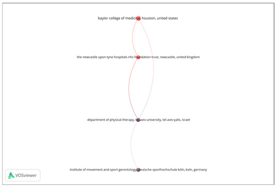 A bibliographic coupling analysis was performed to explore thematic similarities among publication venues based on shared reference patterns. The analysis was restricted to organizations with a minimum of four documents, and the number of documents was used as the weighting metric. As shown in Figure 3, the resulting network reveals a limited number of interconnected institutions, suggesting focused but relatively narrow collaboration patterns in the analyzed research domain. The visualization displays four nodes linked through bibliographic coupling relationships, forming a single, vertically oriented structure that represents distinct yet thematically aligned research entities. The strength of the coupling among these institutions indicates shared research interests and overlapping citation behavior, reflecting a convergence around specific topics such as biomedical engineering, sensor technologies, and aging-related health monitoring. Overall, the bibliographic coupling map underscores the thematic coherence of the leading organizations contributing to this field, while also highlighting the opportunity for broader institutional collaboration to enhance knowledge exchange and interdisciplinary integration.