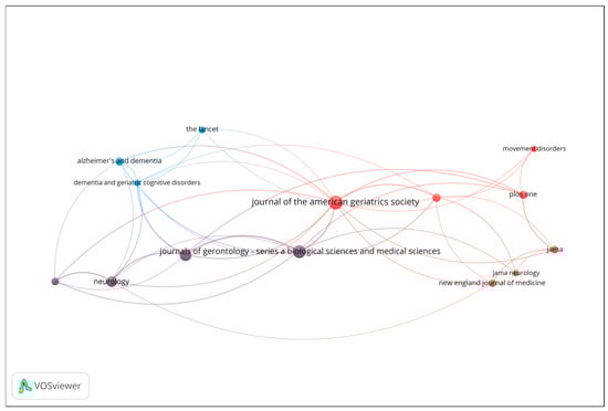 The red cluster, located at the center-right of the map, represents the clinical and neurology-oriented core of the field. It includes highly influential journals such as Journal of the American Geriatrics Society (JAGS), JAMA Neurology, The New England Journal of Medicine (NEJM), JAMA, PLOS ONE, and Movement Disorders. This cluster signifies a strong concentration of general medical and neurological research, highlighting journals that serve as hubs for interdisciplinary clinical studies. The blue cluster, positioned toward the left of the visualization, is associated with dementia and geriatrics research. It comprises journals such as The Lancet, Alzheimer’s & Dementia, and Dementia and Geriatric Cognitive Disorders. These titles form a cohesive subfield focused on neurodegenerative diseases and aging-related health, while maintaining strong citation links to broader clinical outlets, particularly those in the red cluster. The purple cluster, situated between the blue and red regions, acts as a bridge between neurology and gerontology. It includes Neurology and the Journal of Gerontology: Series A (Biological Sciences & Medical Sciences). This cluster connects basic research on aging and neurobiology with clinical and population-level studies, thereby linking specialized and general medical discourses.