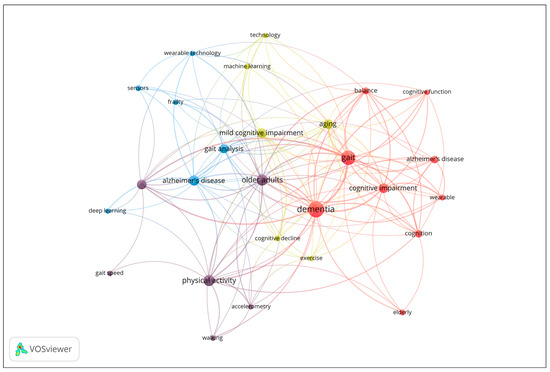 To investigate the thematic structure of the research field, a co-occurrence analysis of author keywords was performed. Keywords with a minimum occurrence of four were included in the analysis, and occurrence frequency was used as the weight metric. The results are displayed in the network visualization in Figure 5, where node size corresponds to the frequency of keyword use, and clustering is determined by co-occurrence strength. The network reveals four main clusters representing distinct but interrelated research themes. The map reveals four distinct thematic clusters. Cluster 1 (red) focuses on cognitive and clinical aspects of dementia, including keywords such as Alzheimer’s disease, cognition, dementia, and gait. Cluster 2 (purple) centers on physical activity and mobility in older adults, with terms like accelerometer, gait speed, and walking. Cluster 3 (blue) represents technological and analytical approaches, including deep learning, sensors, and wearable technology. Finally, Cluster 4 (yellow) highlights aging, cognitive decline, and emerging technologies, with keywords such as machine learning, exercise, and mild cognitive impairment. The network illustrates the interdisciplinary nature of the field, linking clinical, cognitive, and technological research domains in aging and dementia studies.