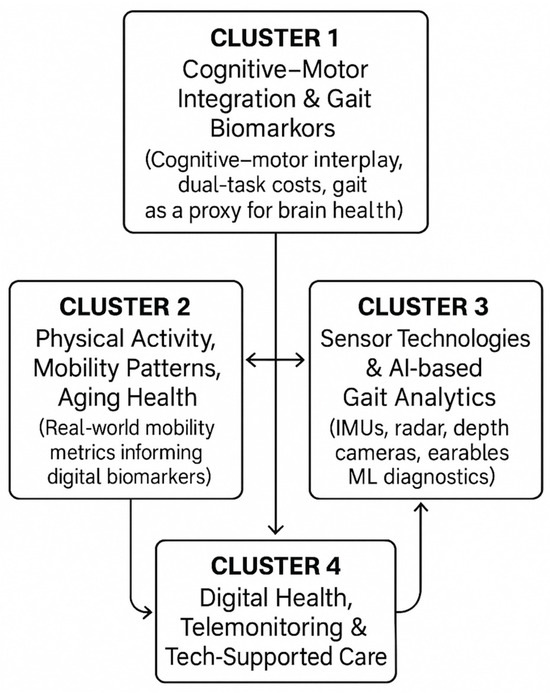 Figure 6 visually depicts the interactions among the four thematic clusters (cognitive–motor integration, physical activity and mobility patterns, sensor/AI-driven gait analytics, and digital-health interventions). This figure highlights how the clusters connect conceptually (e.g., cognitive–motor biomarkers linking to gait features; sensor innovations linking to real-world mobility monitoring) and clarifies the overarching narrative of technological and clinical convergence in the field.