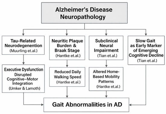 Mechanistic Pathways Linking AD Neuropathology to Alterations in Gait Parameters. The figure summarizes findings from studies on tau-related neurodegeneration (Muurling et al. [52]), neuritic plaque burden and Braak stage (Hantke et al. [119]), subclinical neural impairment and slow gait as an early marker of cognitive decline (Tian et al. [45]), and executive dysfunction affecting cognitive–motor integration (IJmker & Lamoth [64]).
