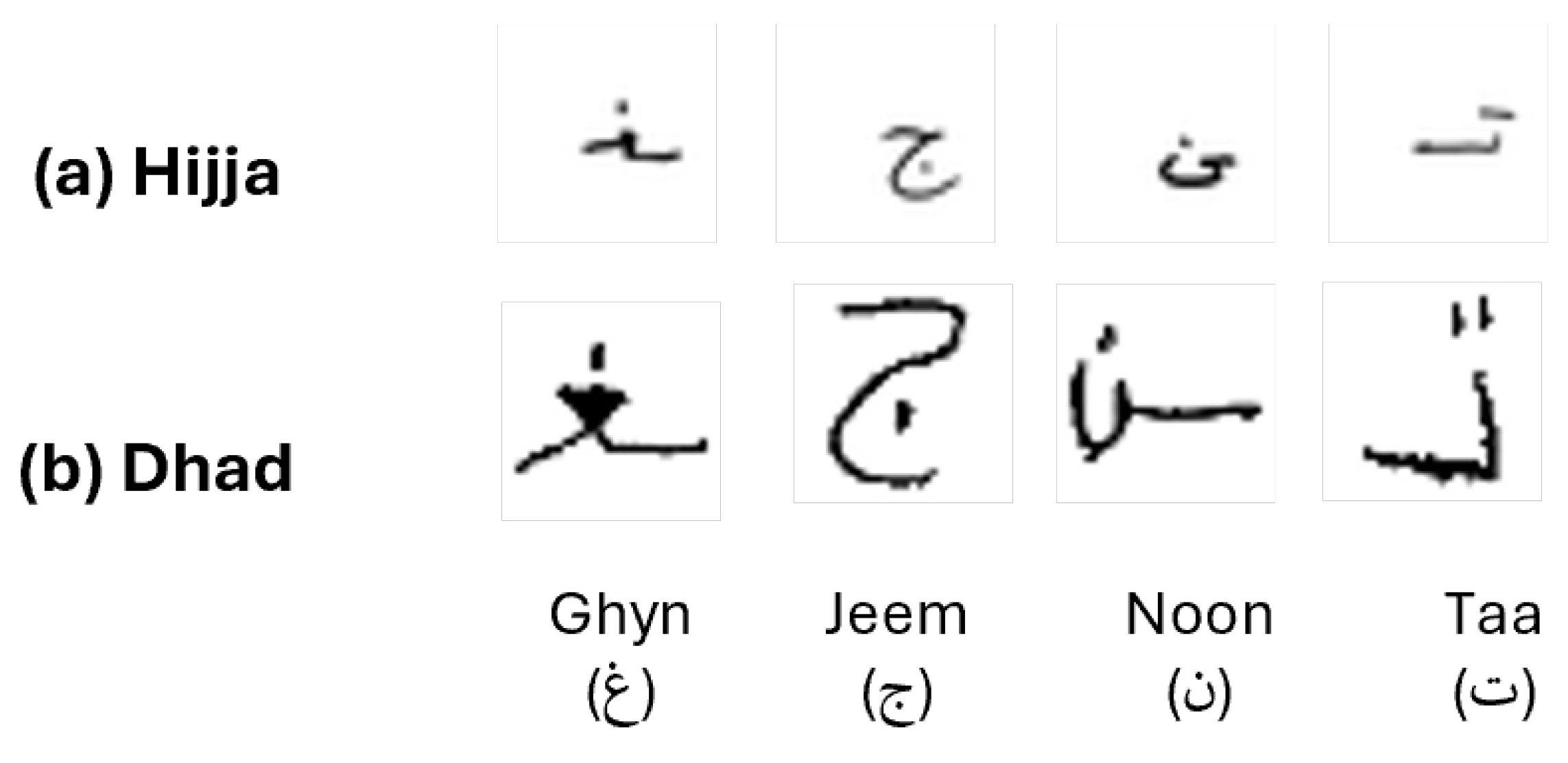 Both datasets present unique challenges due to the diversity of writing styles and variations in sample quality, necessitating the development of robust algorithms for effective recognition. The letters were written in both isolated and connected forms, depending on their positions at the beginning, middle, or end of a word. The characters are provided as grayscale images in both datasets, each standardized to a size of 32 × 32 pixels. Figure 1 shows samples of children’s handwritten Arabic characters from both the Hijja and Dhad datasets. The choice of these datasets allows for a comprehensive evaluation of the proposed system’s ability to handle the complexities of Arabic handwriting, with a specific focus on the challenges posed by children’s writing styles.