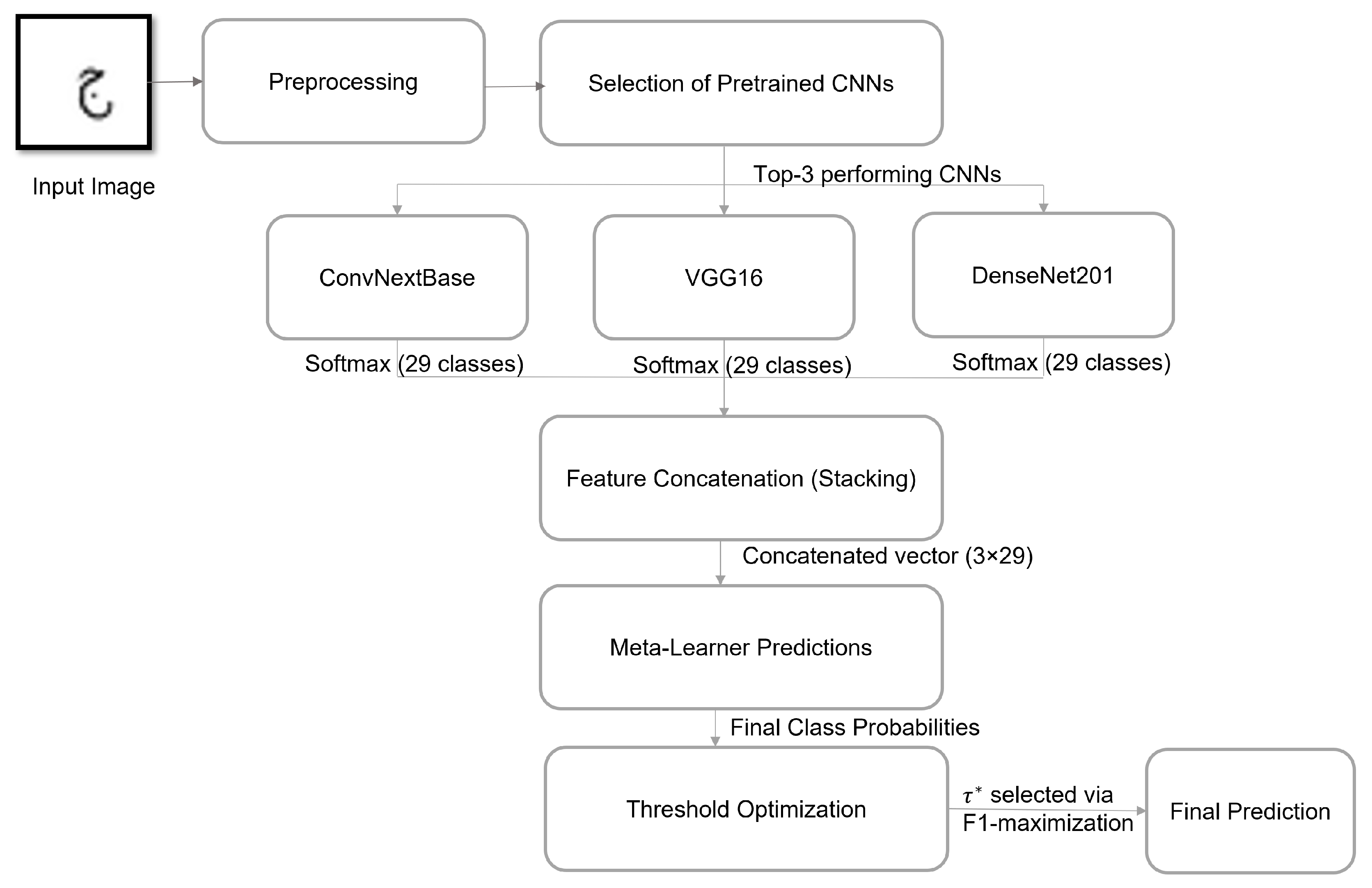 The proposed system follows a thorough multi-stage pipeline that includes data preprocessing, selection of base CNN models, ensemble learning through stacking, and dynamic threshold optimization, as shown in Figure 2. The process begins with image processing and data augmentation techniques. A thorough evaluation of multiple state-of-the-art convolutional neural network (CNN) architectures was conducted to identify the models most suited for the recognition task. The top three performing models were selected as base learners in a stacking ensemble framework. Each model independently generates softmax probability outputs, which are concatenated and passed to a meta-learner, a fully connected neural network trained to learn the optimal combination of predictions. To further improve prediction reliability, a confidence threshold  τ was applied to filter low-confidence outputs, with the optimal value  τ * determined automatically by maximizing the macro-F1 score on the validation set. The subsequent subsections provide a detailed description of each component in this process.