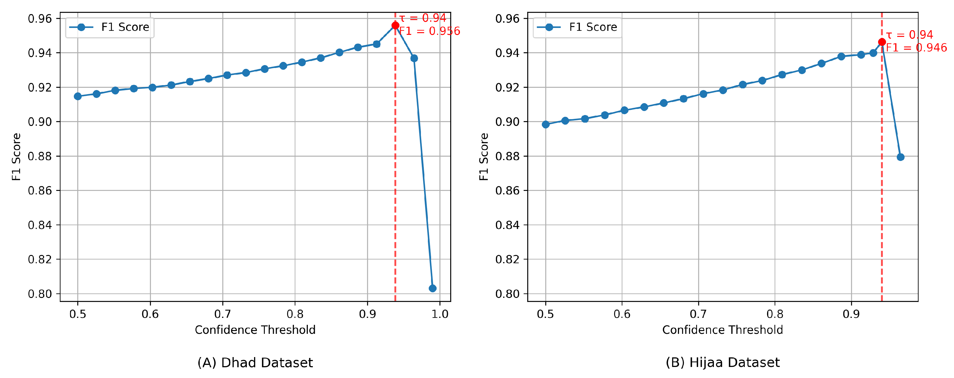 To avoid the pitfalls of arbitrary threshold selection, a dynamic optimization strategy was employed to determine the optimal threshold τ * . Furthermore, to ensure robustness against distribution shifts, τ * was optimized on the combined validation sets from both datasets. This was achieved by evaluating a range of threshold values τ [ 0.5 , 0.99 ] on the validation set and computing performance metrics, such as the macro-averaged F 1 score, precision, and recall, for each. The threshold that yielded the highest F 1 score was selected as the operating point: