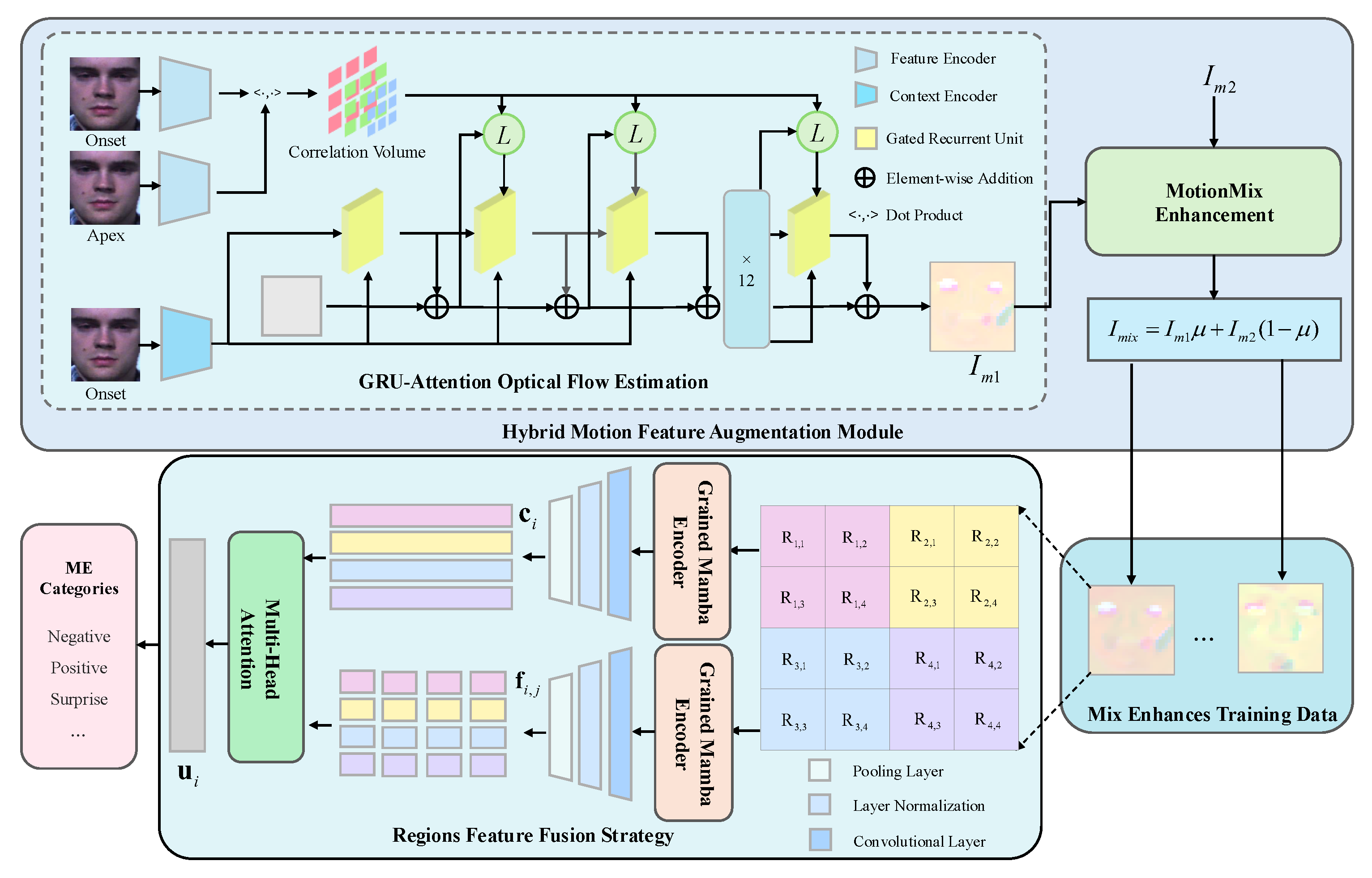 Figure 1, the framework comprises three key components: the Hybrid Motion Feature Augmentation (HMFA) module, a Grained Mamba Encoder, and the Regions Feature Fusion Strategy (RFFS). Together, these modules enable robust and efficient modeling of subtle facial dynamics. Given a pair of onset frame