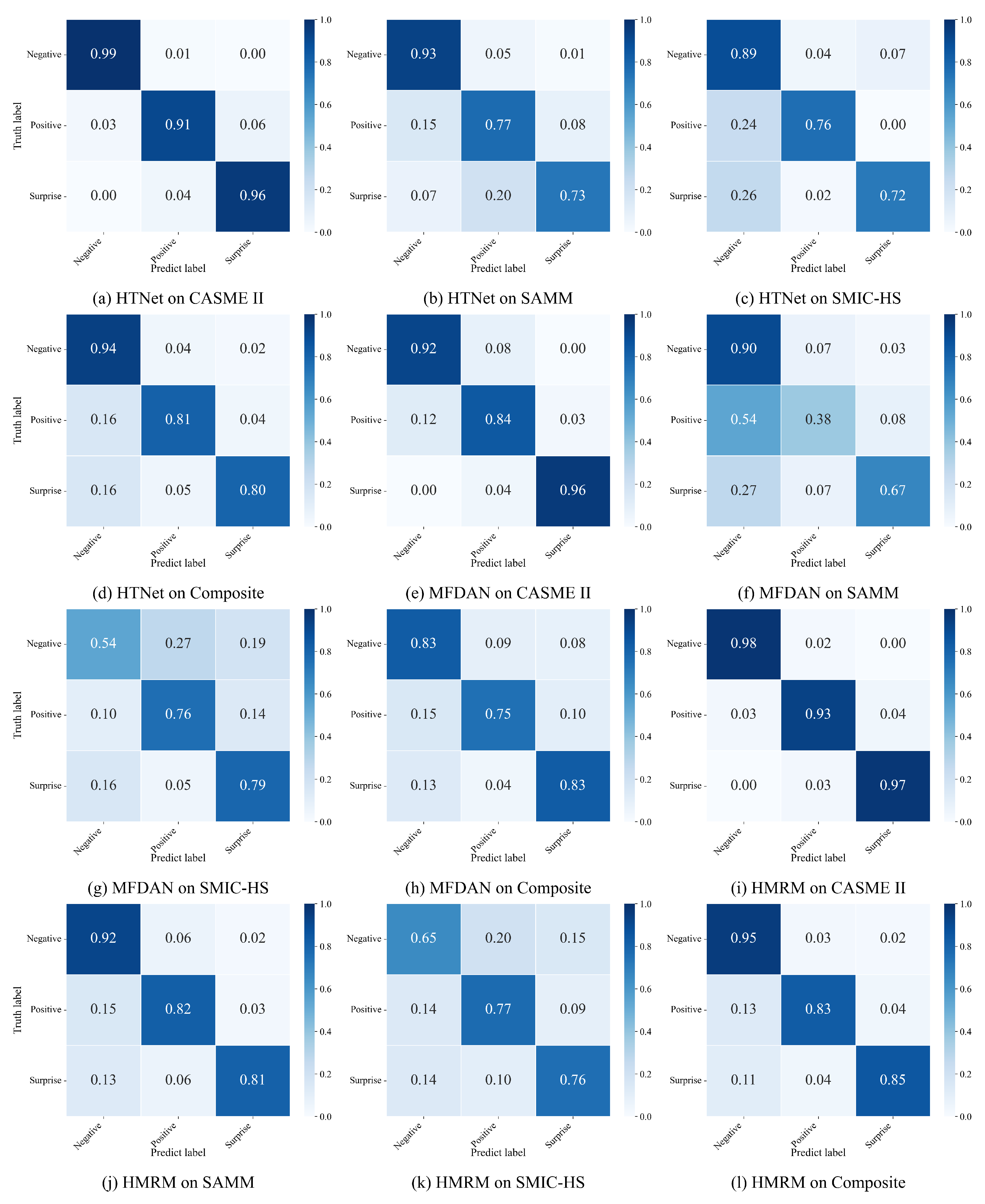 Figure 4 illustrates the confusion matrices of evaluation dataset, and composite datasets. HMRM achieves higher true-positive ratios across all emotion categories, particularly for the Surprise class, where conventional models often suffer from high inter-class confusion. Compared with HTNet and MFDAN, HMRM exhibits lower misclassification rates between Negative and Positive expressions, demonstrating the advantage of its fine-grained regional modeling and motion-guided augmentation in discriminating subtle affective cues. On the high-resolution SAMM datasets, nearly all diagonal values exceed 0.8, indicating that HMRM effectively captures localized muscle activations with minimal false recognition. In contrast, the performance gap on SMIC-HS remains moderate due to its lower spatial resolution, which limits optical flow fidelity. Overall, the confusion matrices confirm that HMRM yields more balanced and discriminative predictions across emotion categories, validating the robustness and generalization of its hybrid motion-region fusion strategy.