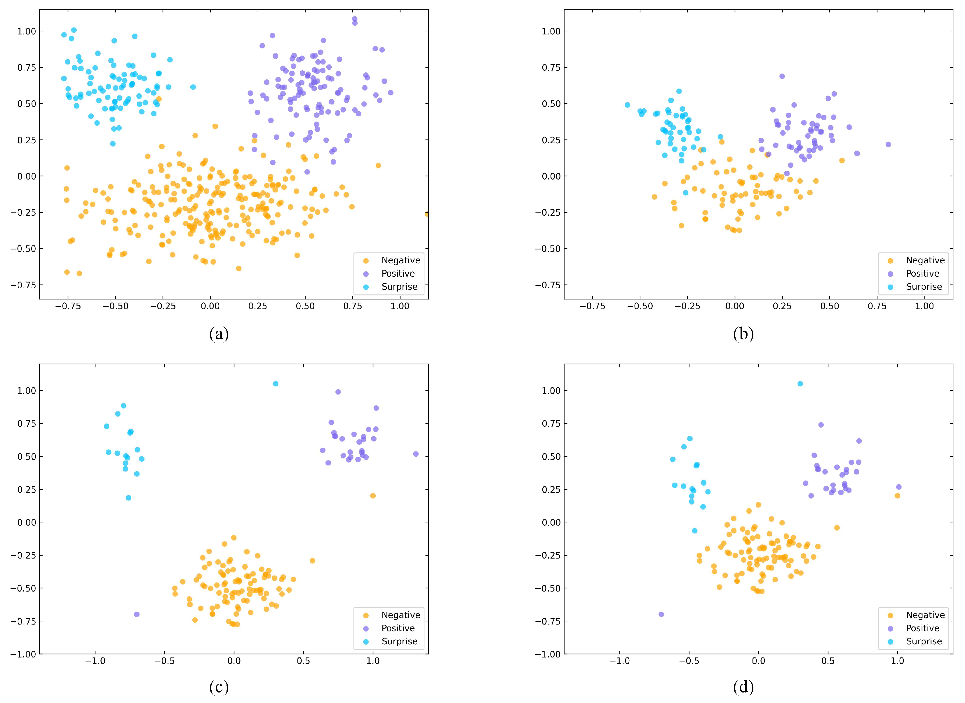 Table 3 presents the results without incorporating the MotionMix Enhancement module. The resulting UF1 and UAR are 0.9207 and 0.9324, respectively, indicating a noticeable drop in overall performance, particularly for underrepresented emotion classes. Upon integrating MotionMix, the UF1 improves to 0.9561 (+3.54%) and UAR to 0.9588 (+2.64%). Specifically, the F1 scores for Negative, Positive, and Surprise emotions increase by 4.1%, 3.8%, and 8.9% respectively, with the Surprise class improving from 0.8213 to 0.8947. These results confirm that MotionMix enhances the model’s capacity to extract dynamic features by leveraging temporal diversity through multi-frame optical flow fusion. It demonstrates strong generalization, particularly in class-imbalanced scenarios.