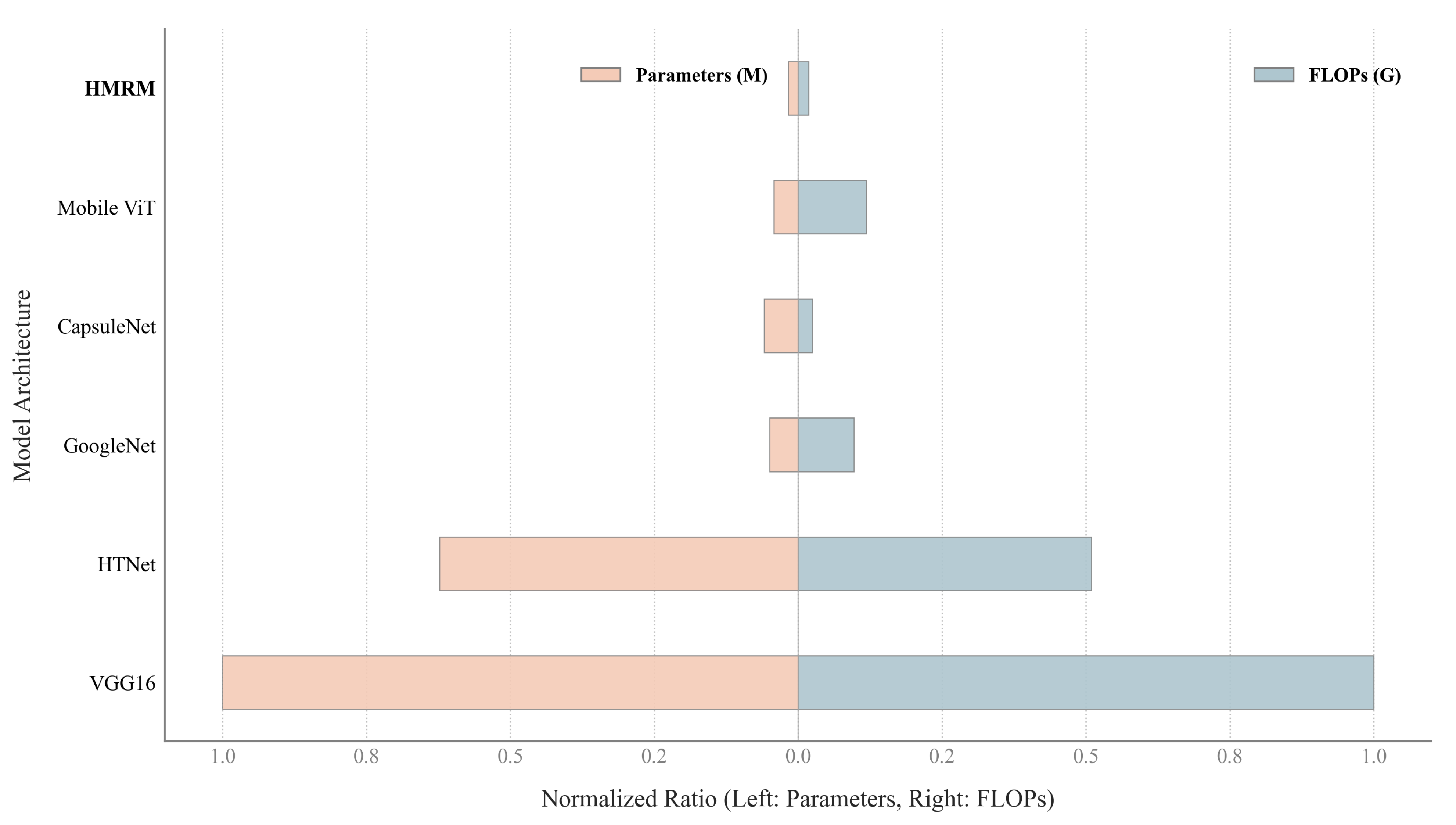 Figure 6. Our method achieves an effective trade-off between model size and recognition accuracy. Specifically, it reduces parameter count by nearly 50% compared to models with similar performance, while maintaining competitive accuracy. This compact design effectively lowers hardware requirements, enabling efficient integration of HMRM into embedded visual sensing devices and facilitating real-time emotion recognition in practical sensing systems.
