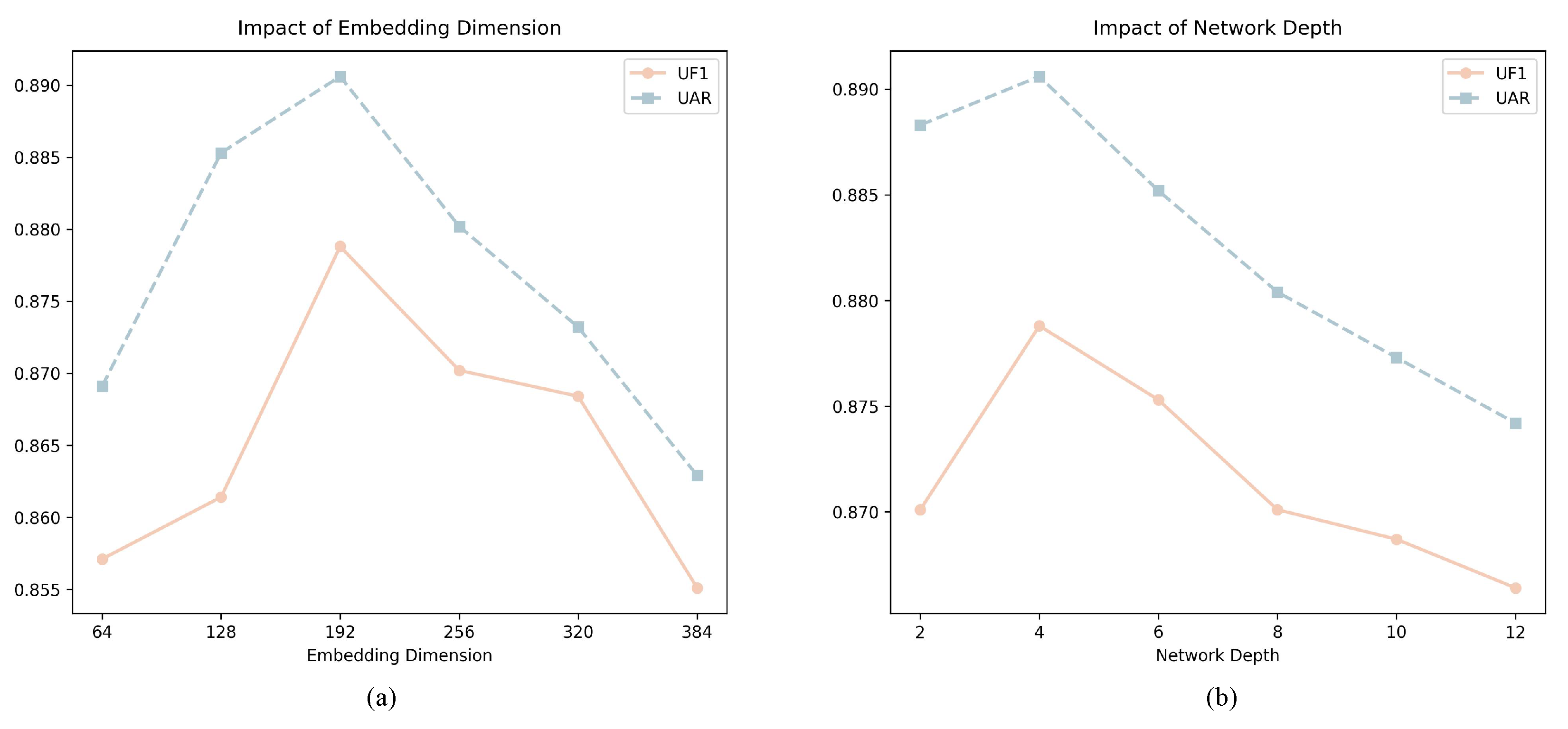 Together, UF1 and UAR provide a robust and unbiased evaluation under class imbalance, avoiding the dominance of majority classes. Additionally, we report the number of parameters and FLOPs to evaluate model efficiency, including memory cost, computational complexity, and deployment feasibility in