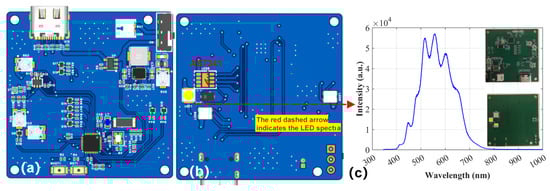 (a) Front and (b) back of PCB layout; (c) Spectrum of white LED; Inset: A photograph of the actual circuit board.