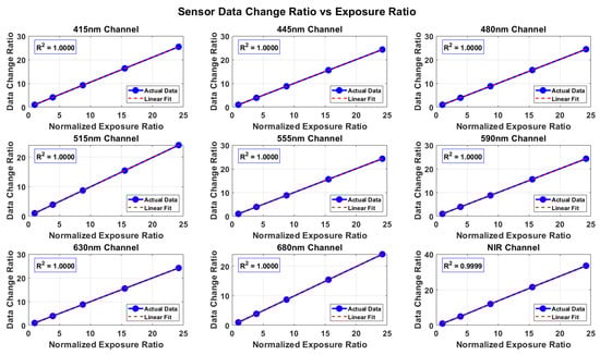 Relationship between multi-spectral signal and exposure time. A linear fit is used to display the response characteristics of each spectral channel at different exposure times.