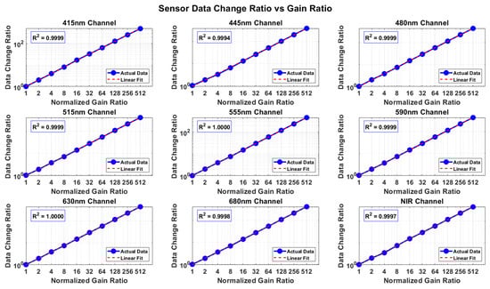 Similarly, to evaluate the response characteristics of the AS7341 multi-channel detector under different gain settings, gain tests were performed on 9 spectral channels with 1×–512× gain. The results of Figure 4 shows that, except for a few channels exhibiting slight deviations, the responses of all channels demonstrate good linearity, indicating that the AS7341 module has good linear response characteristics over a wide dynamic range. Overall, the above test results verify that the sensor exhibits stable and repeatable photoelectric response characteristics in multi-channel spectral measurements, providing a reliable foundation for subsequent accurate quantitative spectral analysis.