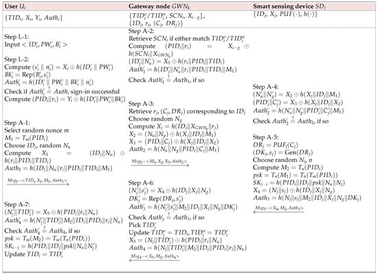 - Step A-3: For , retrieves and selects a random nonce . The following computations are then performed:Finally, constructs as and transmits it to through an open insecure channel.
