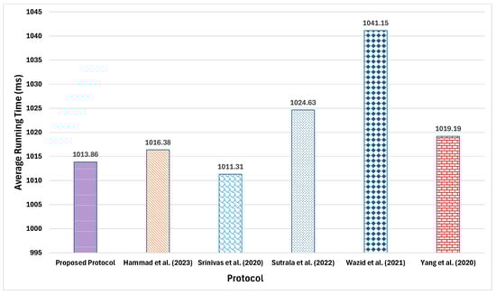 Table 8 presents a comparison of the proposed protocol against the benchmark protocols: Hammad et al. [60], Wazid et al. [61], Yang et al. [62], Sutrala et al. [63], and Srinivas et al. [64]. The comparison evaluates thirteen security and functionality features: : Smart sensing device capture attack; : Anonymity; : Untraceability; : De-synchronization attack; : Replay attack; : MitM attack;
