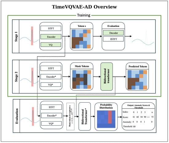 TimeVQVAE-AD models normal temporal dynamics as a probabilistic density over discrete, time-frequency tokens and detects anomalies by low likelihood. The method has two stages followed by an evaluation/scoring [26]. A visual overview of the TimeVQVAE-AD approach is provided in Figure 4.