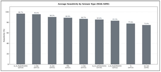 When applying the Seizure Detection Window (SDW), average sensitivities increase markedly across all seizure types, reflecting the extended temporal tolerance for detecting seizure-related ECG abnormalities. As shown in Figure 7, the highest detectability is observed for hyperkinetic focal impaired-awareness seizures (ia_m_hyperkinetic), which reach an average sensitivity of 96.67% (). Non-motor focal aware seizures (a_nm) also achieve very high sensitivity (95.56%, ), followed by non-motor focal impaired-awareness seizures (ia_nm) with 90.30% (), which represent the most frequent seizure type in the test set.