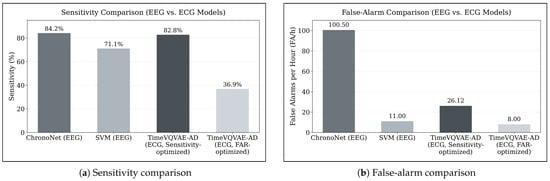 Across seizure types, substantial variability in detectability emerges when using the sensitivity-optimized configurations under the strict evaluation criterion (no SDW). As illustrated in Figure 6, focal-to-bilateral tonic-clonic seizures (f2b) show the highest average sensitivity (76.19%, ), indicating that these seizures exhibit the most consistent ECG abnormalities detectable by all three models. Hyperkinetic and automatisms-dominant focal impaired-awareness seizures also achieve comparatively high sensitivities (ia_m_automatisms: 68.75%, ; ia_m_hyperkinetic: 60.0%, ).