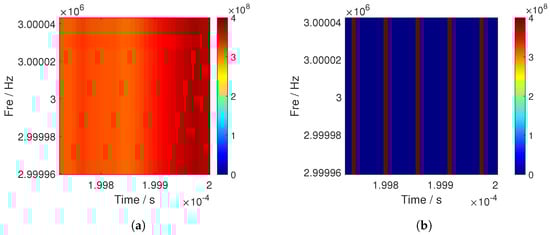 When , this indicates that the signal energy concentration reaches the highest at present, and the TF characteristic of the DSSS signal becomes clearer and easier to interpret, which facilitates subsequent signal processing and analysis. Therefore, by substituting Equation (9) into Equation (8), the new CWT coefficient is expressed.