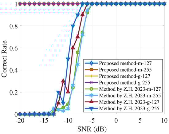 Figure 5 compares the chip rate estimation results for spread spectrum code lengths of 64, 127, and 255 across different SNR levels. The longer the spreading code, the wider the spectral distribution of the DSSS signal, which improves its anti-interference capability. The Morlet wavelet transform power spectrum method confirms this relationship, but the estimation performance with spreading code lengths of 127 and 255 is similar at −6 dB. In contrast, the proposed method demonstrates perfect estimation accuracy irrespective of the spreading code length.