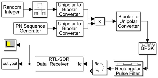 Figure 8 depicts the block diagram of an RTL-SDR receiver for the acquisition of DSSS signals. The DSSS transmitter signal was constructed using modular components within simulation software. Data acquisition was conducted using the RTL-SDR receiver, and the output was saved in the ‘yout’ module.