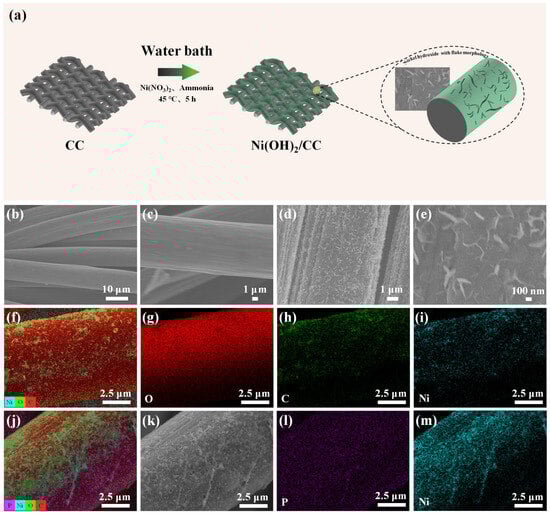 As shown in Figure 1a, a flow chart of the preparation of Ni(OH)2/CC electrodes is illustrated. The electrode with Ni(OH)2 modified carbon cloth was obtained by water bath preparation on the surface of interleaved, smooth, and impurity-free bare carbon cloth. Among them, the precursor solution was obtained from Ni(NO3)2 and ammonia in a certain proportion (see Experimental Section 2.3 for details), with a water bath time of 5 h and a temperature of 45 °C. It can be seen that the nickel hydroxide on the surface of the carbon cloth presents thin flakes, which are uniformly and non-accumulatively distributed on the surface of the carbon cloth.