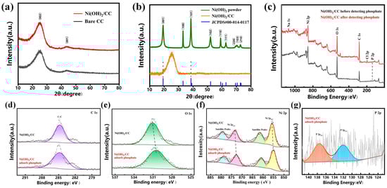 (a) XRD pattern of Ni(OH)2/CC and bare CC electrodes. (b) XRD patterns of powders and Ni(OH)2/CC obtained with longer preparation time. XPS spectra of Ni(OH)2/CC before and after electrode testing: (c) survey spectrum, (d) C 1s, (e) O 1s, (f) Ni 2p, and (g) P 2p.