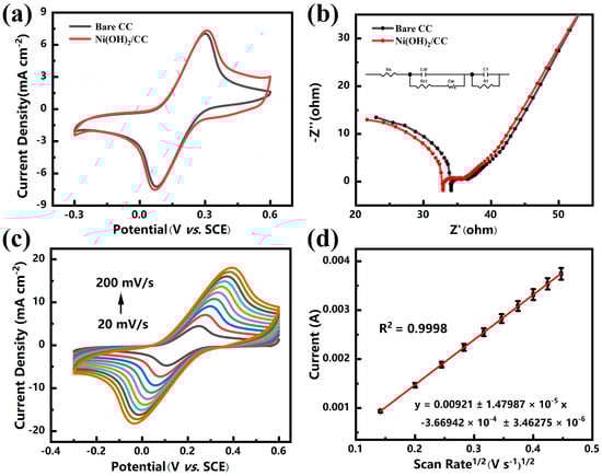 (a) CVs and (b) EIS spectrum of Ni(OH)2/CC and bare CC electrodes in 0.1 M KCl solution containing 5.0 mM [Fe(CN)6]3−/4−. (c) CVs of the Ni(OH)2/CC electrode in 0.1 M KCl containing 5.0 mM [Fe(CN)6]3−/4− at different scan rates (20–200 mV s−1). (d) Linear relationship between oxidation peak current and the square root of scan rate.