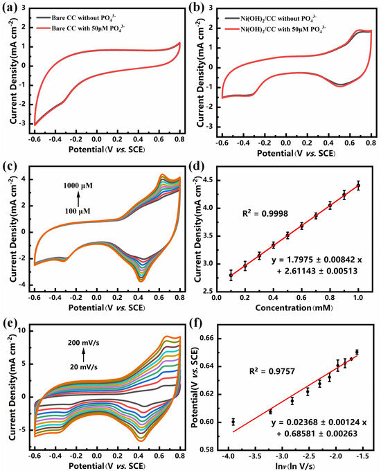 The effect of Ni(OH)2 on the phosphate detection performance was verified by investigating the changes in current response to phosphate at the electrodes, obtained before and after Ni(OH)2 modification of carbon cloth by cyclic voltammetry. As shown in Figure 4a,b, it can be seen that the carbon cloth electrode did not exhibit any oxidation or reduction peaks when phosphate was not added, whereas the Ni(OH)2/CC electrode showed a pair of obvious redox peaks at 0.65 V as well as at 0.53 V. According to the studies in the published literature, the redox peaks here belong to the variation of Ni of Ni(OH)2 itself [31], which is a pair of reversible redox peaks. After the addition of phosphate, no new redox peaks appeared in the carbon cloth electrode, and the current response did not change significantly, while the current response of the redox peaks became higher with the addition of phosphate, which suggests that the modification of the carbon cloth electrode by Ni(OH)2 has equipped the modified electrode with the sensitivity to phosphate.