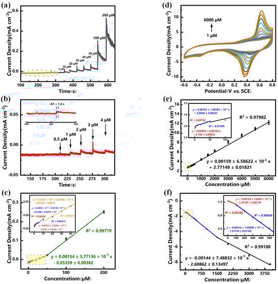 We investigated the performance of the sensitive electrodes for the linear detection of phosphate under the timed-current method, and we chose the potential at the oxidation peak in the cyclic voltammetry test as the potential in the timed-current method for the test. As shown in Figure 5a,b. It can be seen that, with the addition of different concentrations of phosphate, the current responses of the Ni(OH)2/CC electrode all increased sharply, showing a gradual stepwise upward trend, and reached the maximum value in a very short time (1.8 s), which indicates that the nitrite diffused rapidly to the vicinity of the surface of the Ni(OH)2/CC electrode and was adsorbed rapidly, altering the charge distribution of the surface of the electrode, causing the electron transfer, and leading to the current response change. The above phenomena demonstrated the excellent electrocatalytic activity, large electrochemically active surface area, and superior electron transfer capability of the Ni(OH)2/CC electrode. As shown in Figure 5c, the current response exhibited a good linear relationship with the nitrite concentration at the low concentration ranging over 1–4 μM: Ipa (mA cm−2) = 0.00153 ± 1.70223 × 10−4 C (μM) − 0.0165 ± 4.35432 × 10−4 (R2 = 0.96388), and the high sensitivity was 1530 μA mM−1 cm−2; at the middle concentration ranging over 4–10 μM, the linear equation was Ipa (mA cm−2) = 0.000863895 ± 9.56186 × 10−5 C (μM) − 0.01486 ± 4.83975 × 10−4 (R2 = 0.96413), and the high sensitivity was 863.895 μA mM−1 cm−2; at the high concentration ranging over 10–50 μM, the linear equation was Ipa (mA cm−2) = 0.000751001 ± 6.33448 × 10−5 C (μM) − 0.01632 ± 0.0019 (R2 = 0.97214), and the high sensitivity was 751 μA mM−1 cm−2; at the higher concentration ranging over 50–200 μM, the linear equation was Ipa (mA cm−2) = 0.00154 ± 5.77136 × 10−5 C (μM) − 0.05359 ± 0.00362 (R2 = 0.99719), and the high sensitivity was 1540 μA mM−1 cm−2. From these, the sensitivity of the Ni(OH)2/CC electrode is 1530 μA mM−1 cm−2, and the limit of detection (LOD) of the Ni(OH)2/CC electrode for phosphate is as low as 0.59 μM (S/N = 3), which is lower than the nationally defined threshold for eutrophication of the water body (0.5 mg/L [4]). However, we found that using the amperometry method to study the sensitivity of the Ni(OH)2/CC electrode for the detection of phosphate, in the low concentration range (1–50 μM), the current response changed rapidly with the addition of phosphate and stabilized within a short period of time, whereas in the middle and high concentration range (100–200 μM), although the current response changes rapidly with the addition of phosphate, it does not stabilize but rather decreases over time, which is detrimental to the accuracy of the assay. We speculate that this is because although phosphate is adsorbed on the electrode surface, there is a limit to the amount of phosphate that can be strongly adsorbed on the electrode surface under stirring conditions, so vigorous stirring dislodges the extra phosphate, leading ultimately to a sustained decrease in the current response.