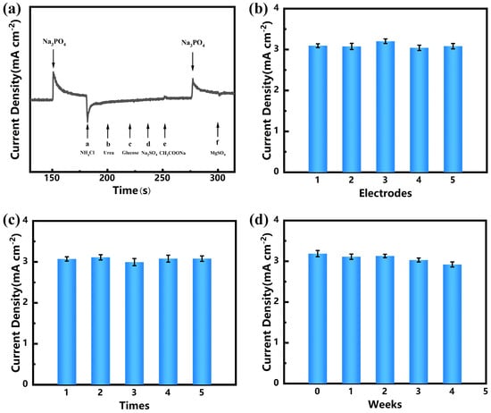 (a) Amperometry curve of Ni(OH)2/CC towards 20 μM PO43− and 1.0 mM interferents (a–f: NH4Cl, urea, glucose, Na2SO4, CH3COONa, MgSO4) at 0.67 V. (b) Comparative histogram of peak current of 0.1 mM phosphate oxidation by five independent Ni(OH)2/CC. (c) Comparative histogram of peak current of a Ni(OH)2/CC for five consecutive tests on 0.1 mM PO43−. (d) Comparative column diagram of peak current for 0.1 mM phosphate oxidation on Ni(OH)2/CC following 0–4 weeks of storage.