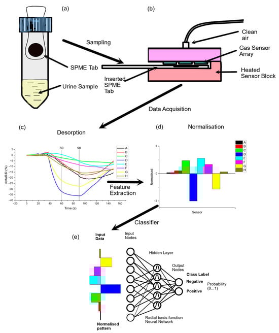 Schematic showing (a) sampling of VOCs from urine sample headspace using an SPME tab sampler for adsorption of volatiles, (b) desorption of adsorbed volatiles from tab onto a gas sensor array, (c) raw data from the array of sensors (each sensor has a different spectrum of response to different volatile chemicals), (d) feature extraction to produce a normalised fingerprint that can be added to a database for training a classifier (e) comprising a radial basis function neural network.