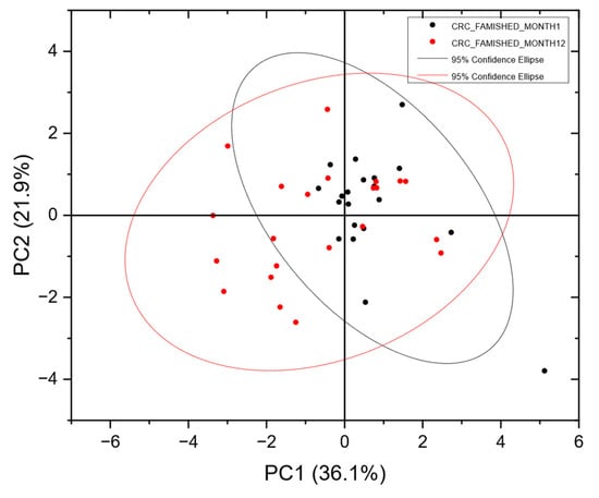PCA Scores plot of CRC-positive batches from the FAMISHED population measured at month 1 and month 12, showing significant overlap in the two populations, indicating consistency in the CRC samples and repeatable instrument performance. In the Scores plot, each point represents a single urine sample from a subject. The distance between one point and another is dependent on the variance between one VOC pattern and another. Data were analysed without any prior assumptions as to which class they may belong to.