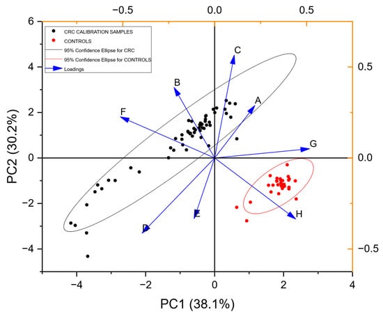PCA Scores and Loadings plot (training set) for all the calibration samples from populations of CRC-positive and control urine VOCs (Table 1). Principal components axis 1 (PC1) accounts for 38.1% of the information content, while axis 2 (PC2) accounts for 30.2%. The Loadings plot shown with the arrows represents the relative contributions of the individual gas sensors in the array to discrimination between potential classes in the data.