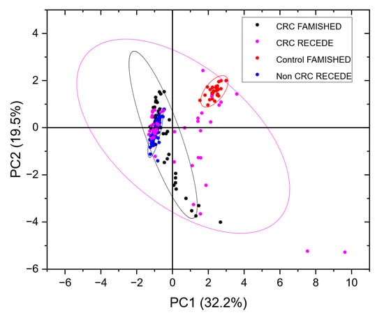 In contrast to the tightly grouped clusters seen in the calibration data from the FAMISHED study, the RECEDE CRC-positive data were more dispersed. However, there was still some overlap between the CRC samples from both the FAMISHED and RECEDE cohorts. Conversely, the non-CRC/control RECEDE samples were rather disparate from the control group of FAMISHED samples.