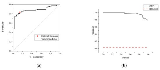 By testing a sample population, the proportion of individuals with positive conditions can be calculated—the so-called apparent prevalence. From apparent prevalence, the true prevalence in the entire population can be calculated. The prevalence of the CRC population (0.05) is very small compared to the total sample size of those referred for colonoscopy, and hence reliable detection becomes a difficult task. As the sample populations are imbalanced, a negative case for most examples and a positive case for a few examples, an ROC curve in some cases can be misleading. Precision quantifies the number of correct positive predictions made. Recall quantifies the number of correct positive predictions made out of all positive predictions. A precision–recall curve (Figure 6b) was calculated for different probability thresholds. This showed good performance over a random classifier, shown as a horizontal dotted line, confirming the likelihood of positive predictive value for a CRC-positive population.